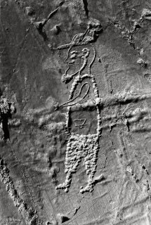 Vallée des Merveilles. Représentation de sauterelles et de personnages. En bas une figure cornue de l'âge du bronze