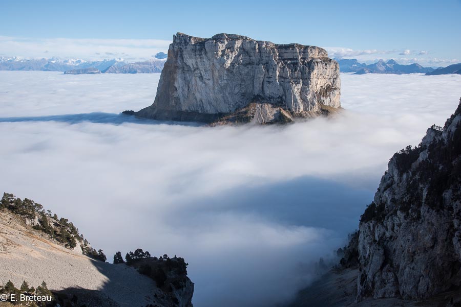 Le mont Aiguille émerge de la mer de nuage devant le pas du Bachassons
